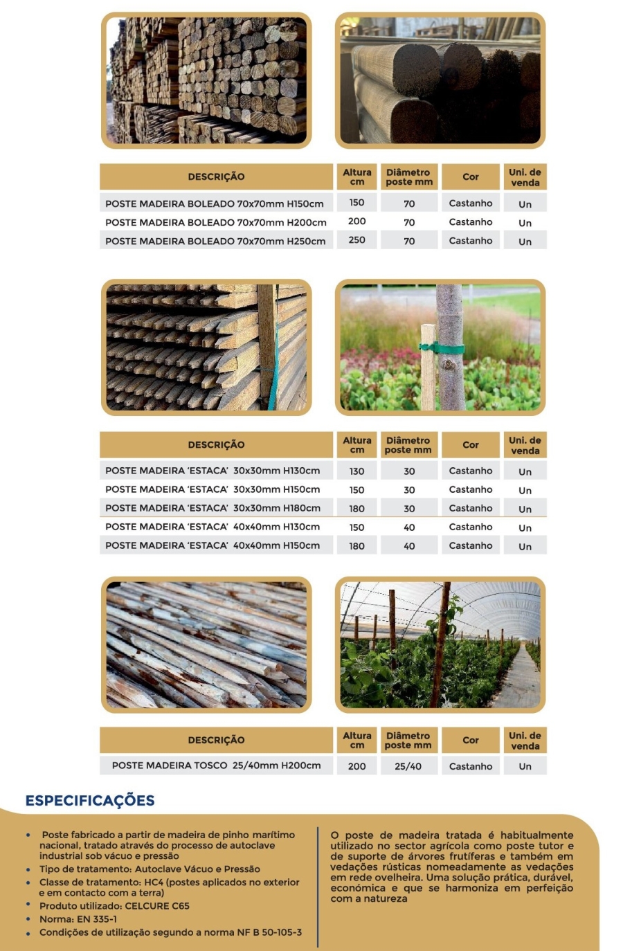 Poste Pinho Nacional Boleado e Quadrado C/ Bico - Fabricado a partir de pinho marítimo nacional, tratado através do processo de autoclave industrial sob vácuo e pressão. Norma: EN 335-1.