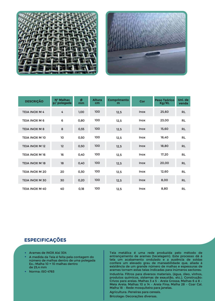 Arames de inox AISI 304 - A media da Teia é feita pela contagem do número de malhas dentro de uma polegada. ( Ex: Malha 10 = 10 malhas dento de 25,4 mm.) - Norma: ISO 4783.