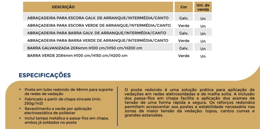 Barra e Abraçadeira para poste redondo - Fabricado a partir de chapa zincada (min. 250g/m2).