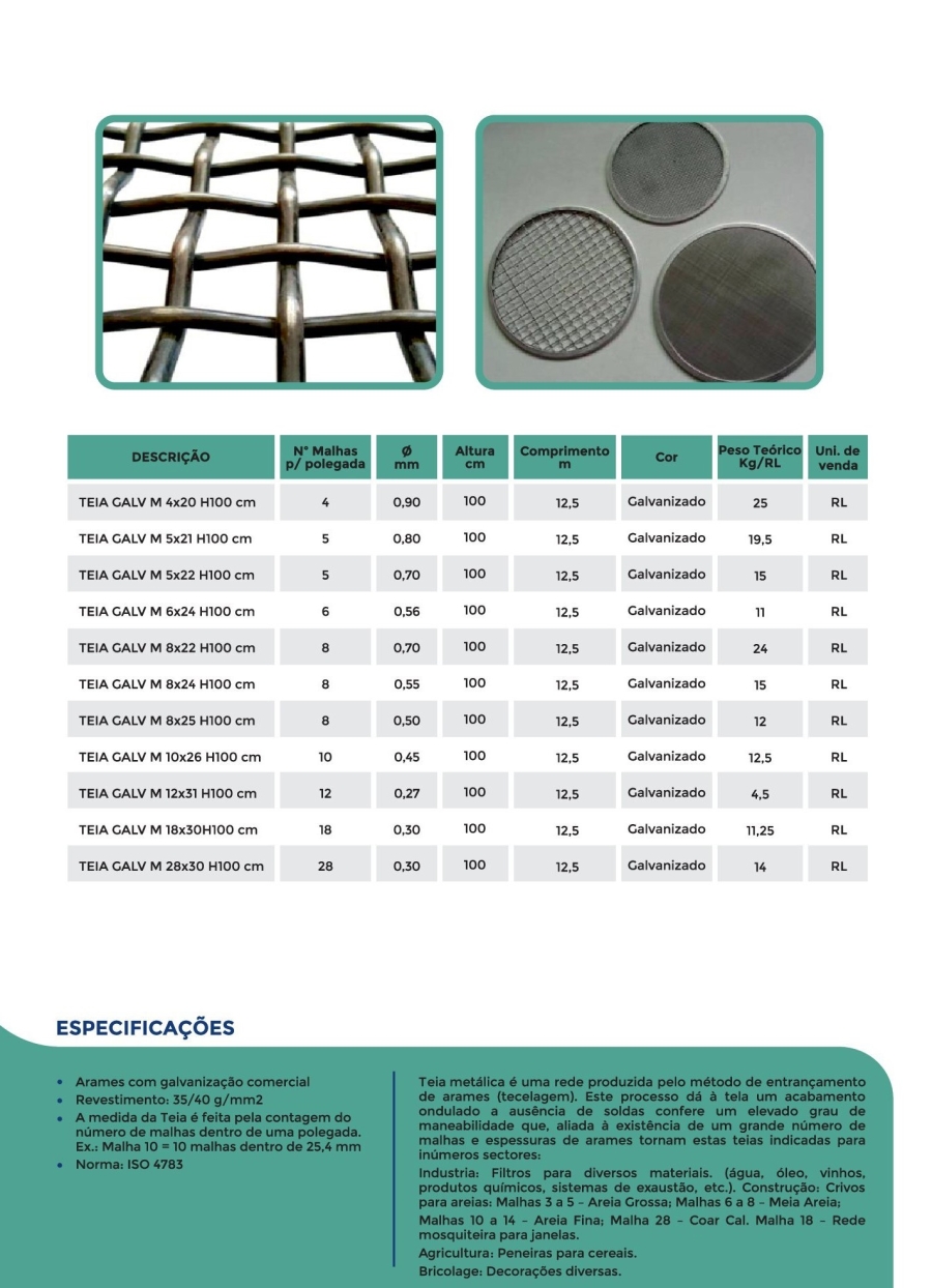 Arames com Galvanização Comercial - A media da Teia é feita pela contagem do número de malhas dentro de uma polegada. ( Ex: Malha 10 = 10 malhas dento de 25,4 mm.) - Norma: ISO 4783.