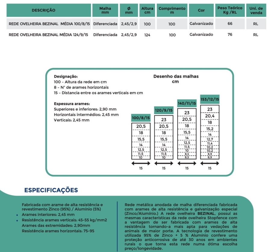 Rede Ovelheira Bezinal Média - Arames interiores:1,90 mm - Arames das extremidades: 2,40 mm