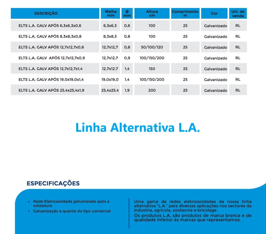 Rede Eletrosoldada L.A. - Rede Galvanizada após soldadura - Galvanização a quente do tipo comercial.