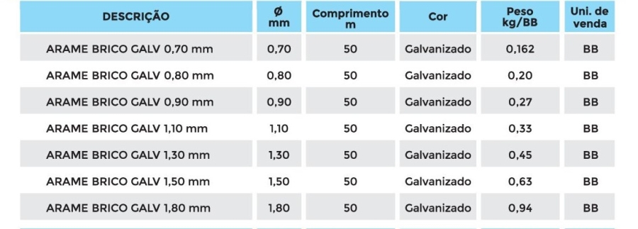 Arame Brico Galvanizado - Carga de rotura: 40-50 Kg/mm2 - Cobertura de zinco: 35-40 Gr/mm2. Arames para variados serviços de bricolage: amarração de redes, amarração de cabos trabalhos manuais de artesanato, etc.