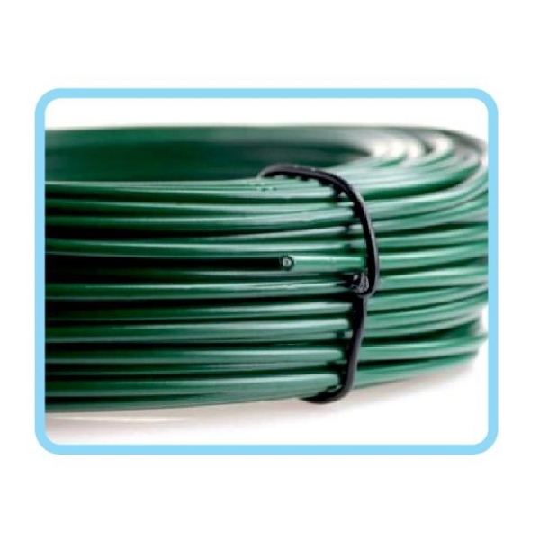 Arame Plastificado - Carga de Rotura: 40/50 Kg. Cobertura de Zinco: 40-50 gr / m2. Revestido a PVC verde. Norma: EN 10245-2.