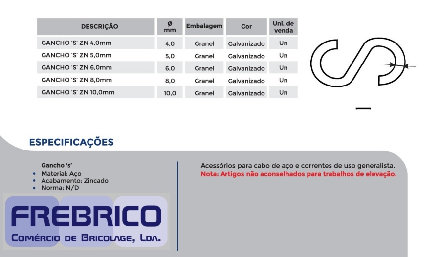 Gancho "S" - Fabricado em Aço - Acabamento Zincado.